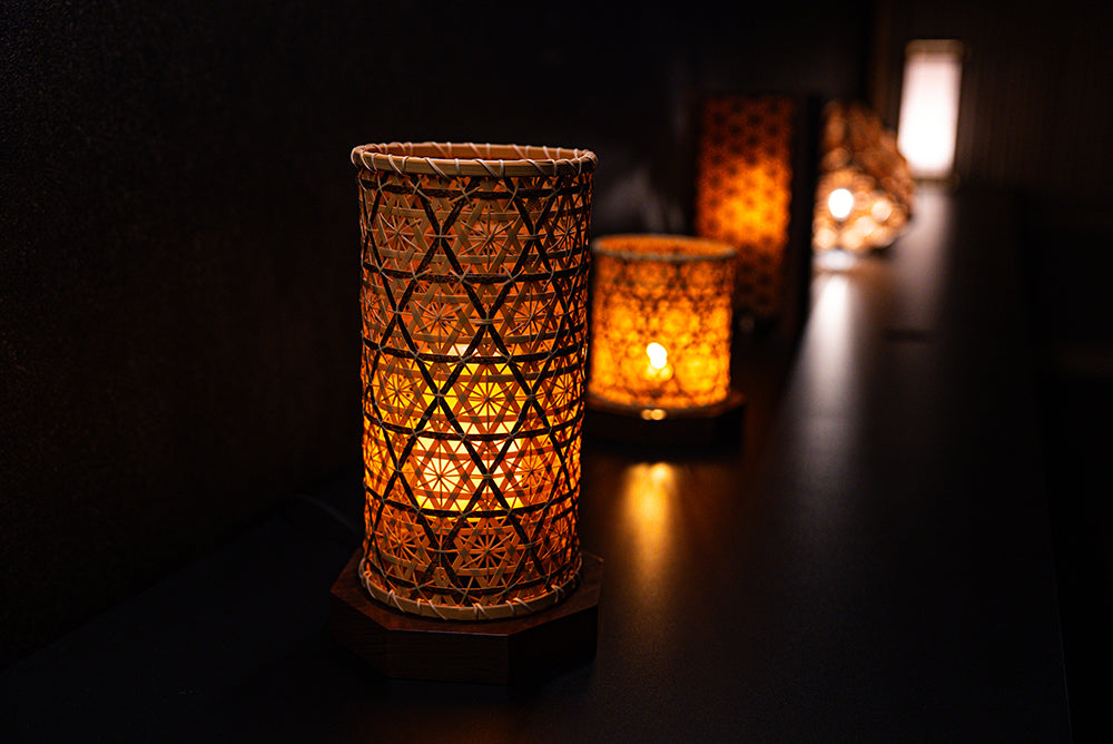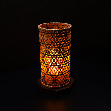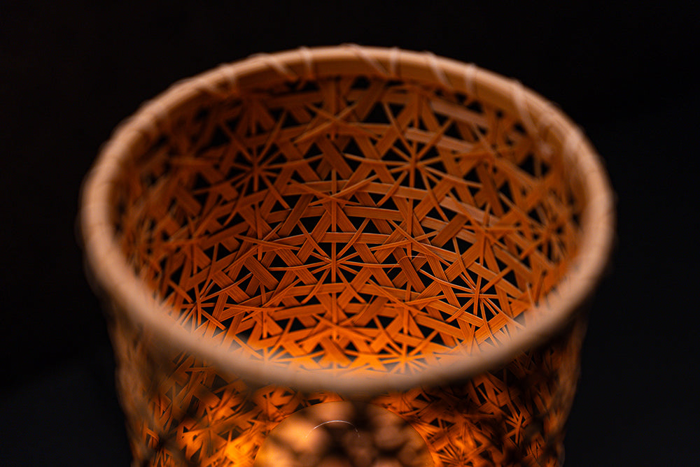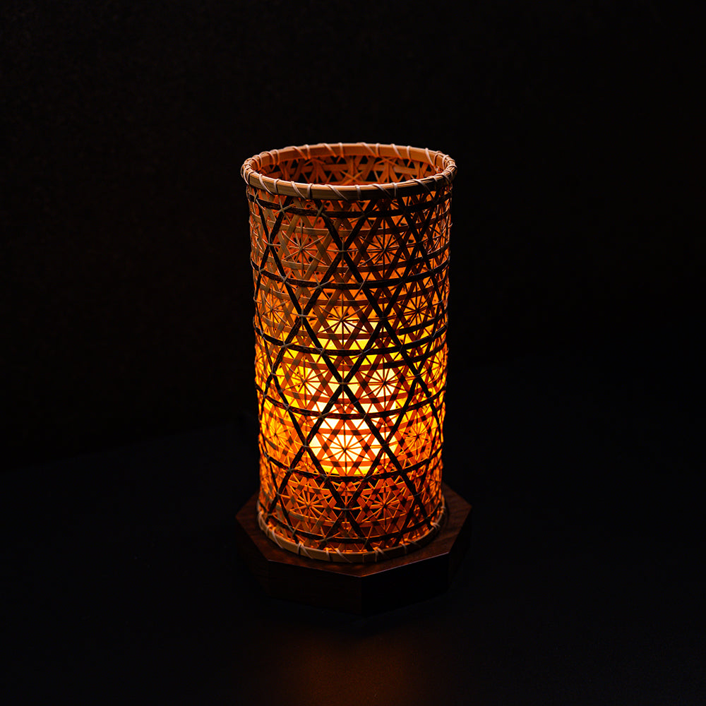 そこにあるだけで美しい存在感を放つ竹細工のランプシェード。伝統の花六つ目編みを施した円筒からは、竹の隙間を通して柔らかな光が広がり、空間にやさしい陰影をもたらします。花六つ目編みは、二枚の六つ目編みを縫い合わせて完成させる高度な技法で、繊細さと強度を兼ね備えています。