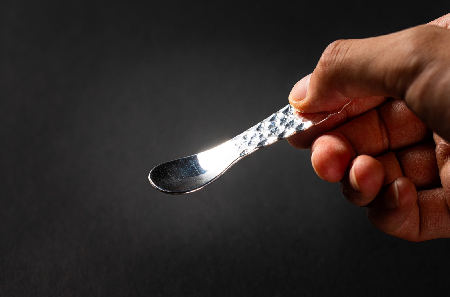 東京銀器の伝統工芸士・上川宗達氏による純銀製のアイススプーン。銀の高い熱伝導により、固いアイスもすっとすくえ、ロックアイスまで切れる実力を備えています。縁鎚目(ゆかりつちめ)模様がひとすくいごとにきらめき、味覚だけでなく目でも楽しませてくれます。ご注文後に一つひとつ手作りで仕上げるため、手元に届くまでの時間も特別な体験に。宗達アートクラフトと日本工芸堂のコラボ企画第二弾として誕生した特別な逸品です。